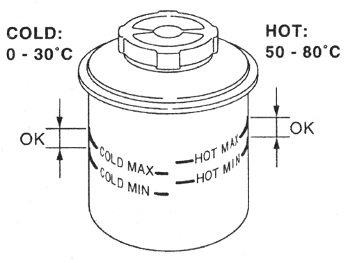 Учтите, что уровень жидкости может изменяться в зависимости от ее температуры. Для обеспечения достоверности показаний уровня при высокой и низкой температуре на бачке предусмотрены метки HIGH (высокая) и LOW (низкая), соответственно.